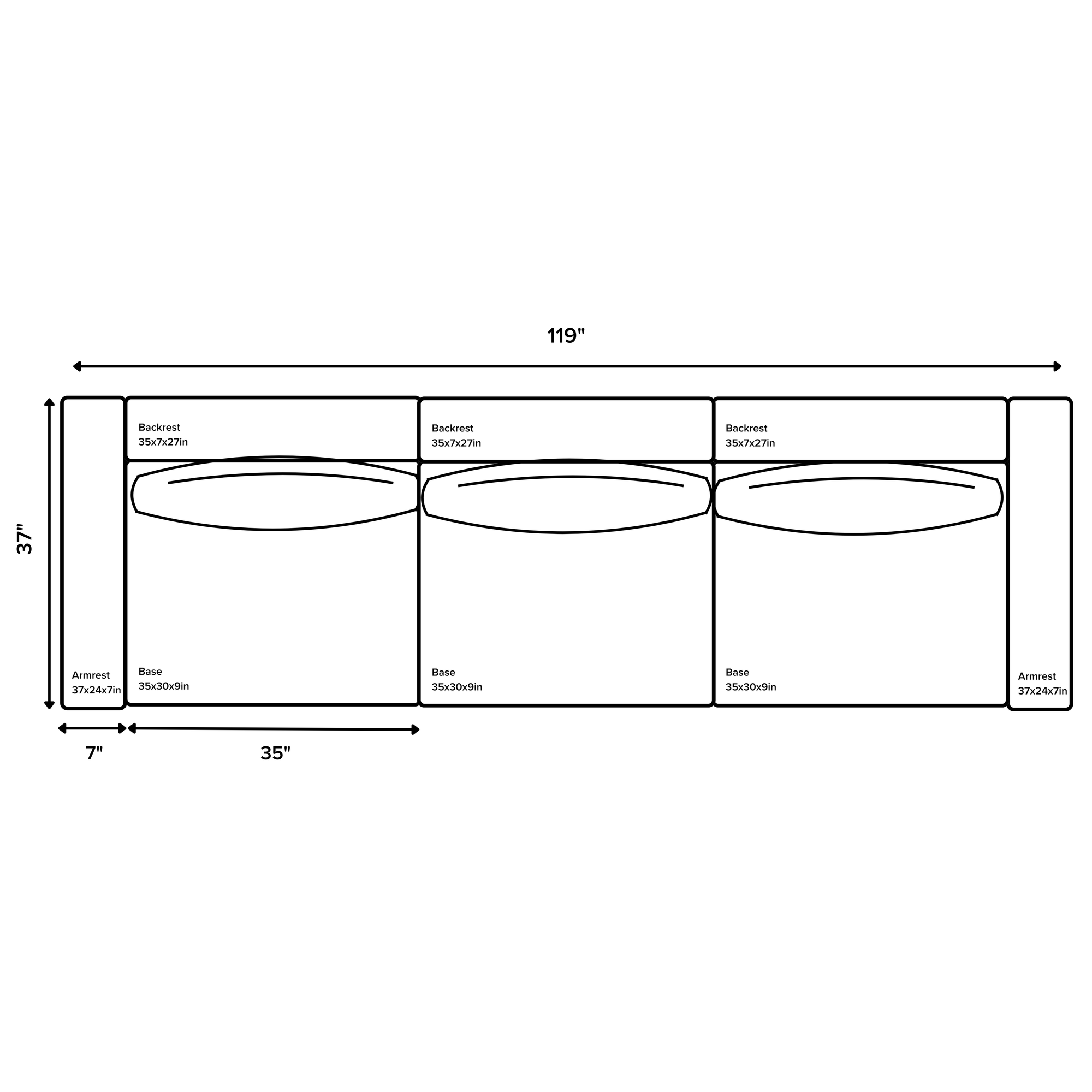 WIDTH: 119" , DEPTH: 37"