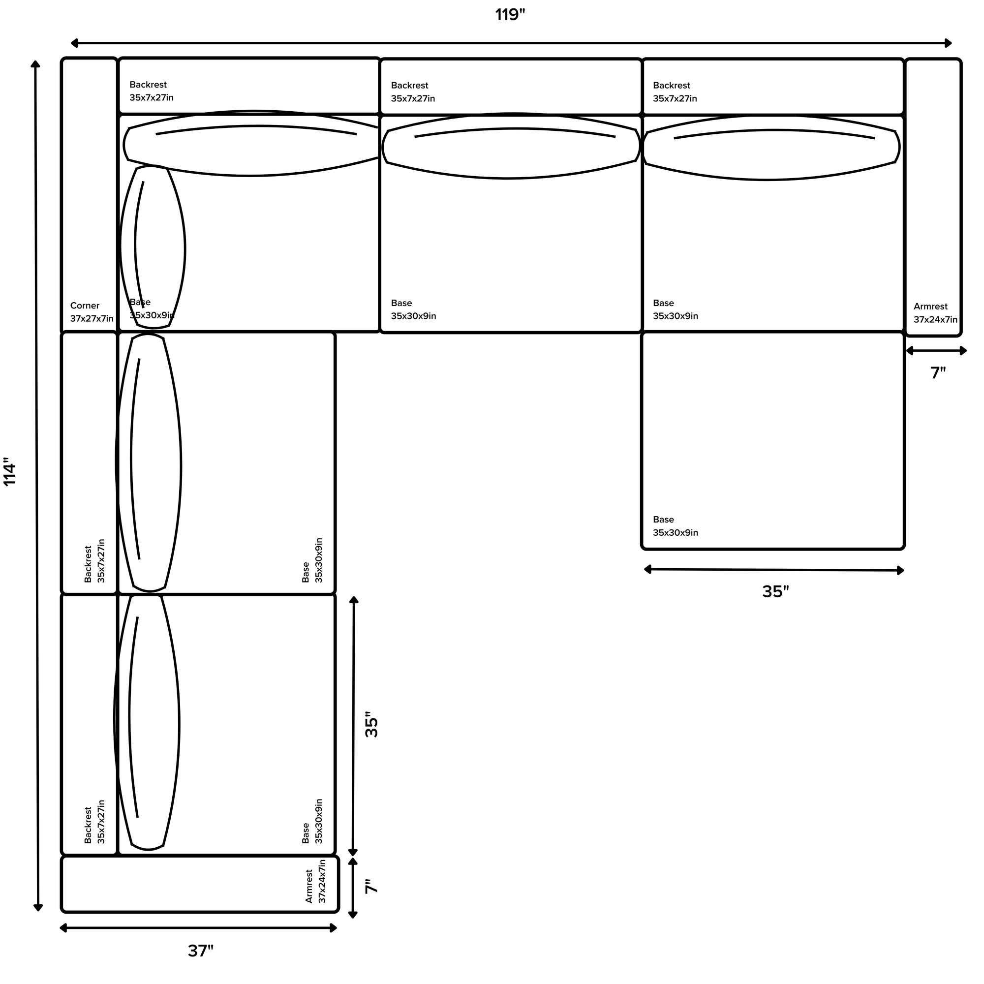 WIDTH: 119", DEPTH: 114"/ 67"